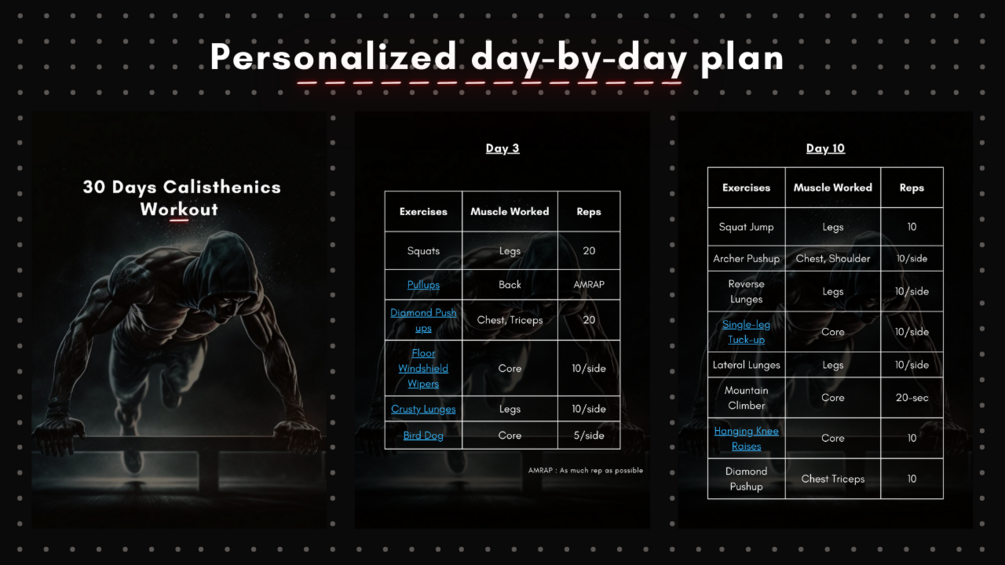 You’ll do basic calisthenics exercises during your first week to prepare your body for challenging exercises. The duration will also be 30 minutes. Once you move forward, exercise difficulty and timing will increase.